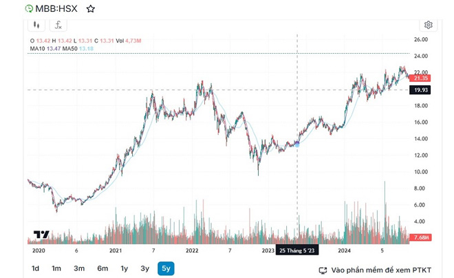 Đặc điểm: Đây là giai đoạn "thử lửa". Dù giá cổ phiếu ở mức thấp do lãi suất cao và tín dụng thắt chặt, MB Bank vẫn duy trì được nền tảng kinh doanh ổn định, tạo tiền đề cho sự bùng nổ sau này.