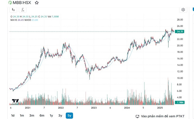 Diễn biến: Sau nhịp điều chỉnh năm 2023, MBB bắt đầu hành trình chinh phục những cột mốc mới. Tính đến giữa năm 2025, cổ phiếu đã xác lập đỉnh lịch sử tại vùng 25.550đ/cp (vào tháng 05/2025). Sau đợt chia cổ tức lớn vào tháng 08/2025 (tỷ lệ 35%), giá cổ phiếu được điều chỉnh và hiện đang giao dịch ổn định quanh mức 24.000 - 24.500đ/cp.