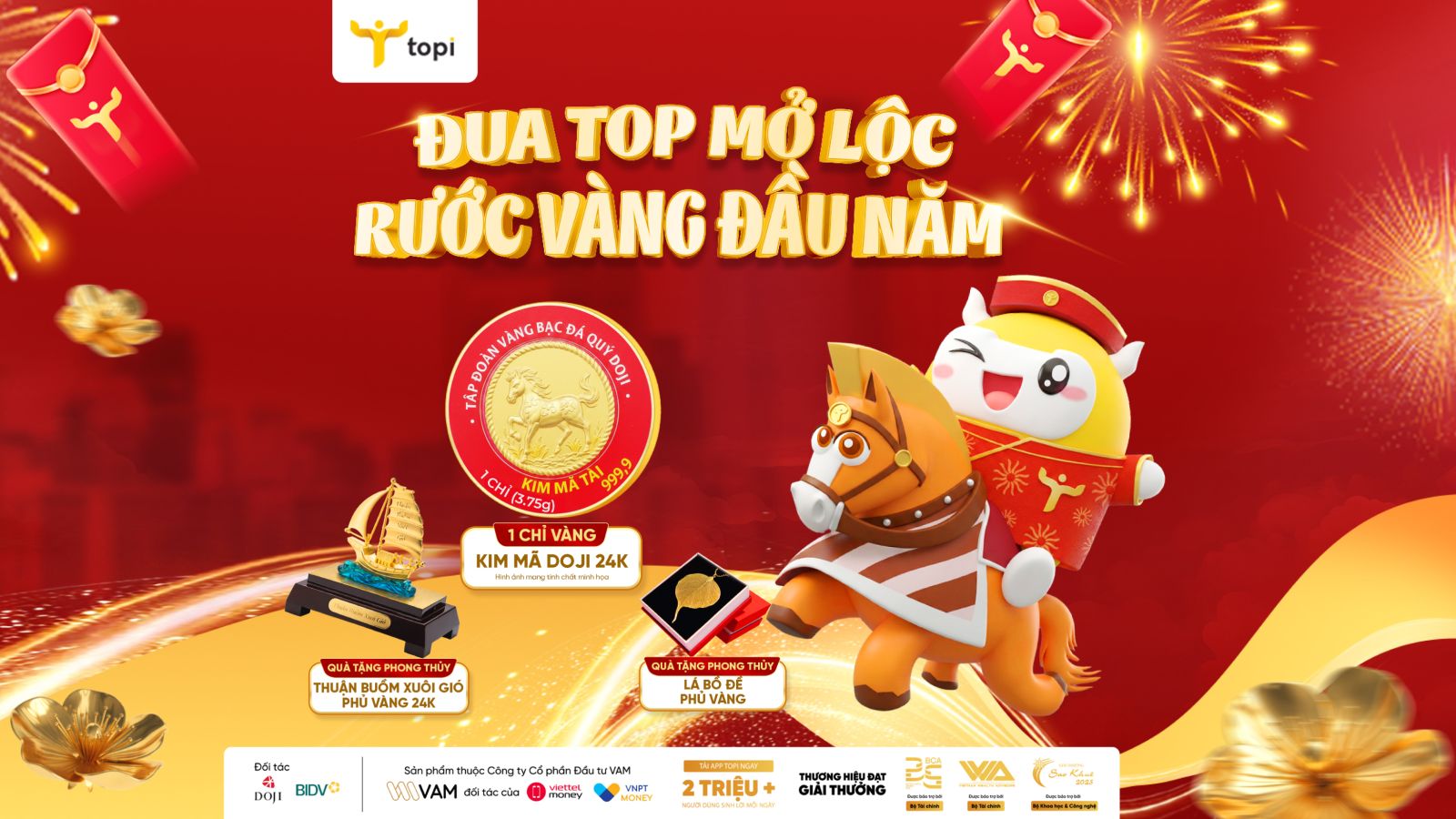 260 phần quà hấp dẫn bao gồm 1 chỉ vàng Kim Mã 24K từ BST Kim Mã 2026 của DOJI được ra đời như một sự tôn vinh dành cho những “chiến mã” trong thời đại mới, Quà tặng phong thủy may mắn tài lộc cho năm mới như Thuận buồm xuôi gió phủ vàng 24K, Lá bồ đề phủ vàng cùng hàng trăm giải thưởng hiện kim dành cho 260 Khách hàng có Tổng tài sản tích lũy mới cuối kỳ CAO NHẤT (1) và ĐĂNG KÝ SỚM NHẤT (2) theo hạn mức với quà tặng tương đương như sau: