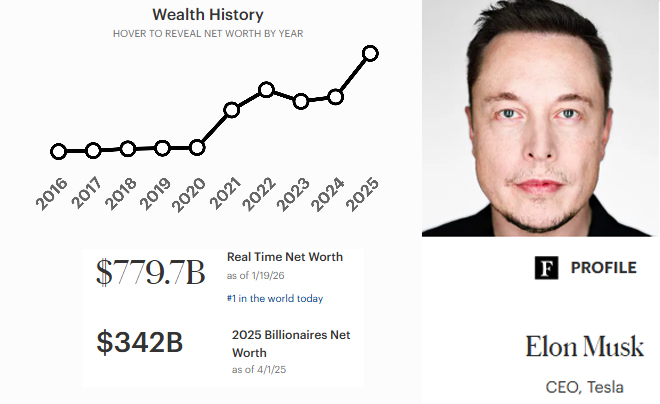 Tính đến tháng 1 năm 2026, Elon Musk không chỉ giữ vững danh hiệu người giàu nhất hành tinh mà còn thiết lập những kỷ lục vô tiền khoáng hậu trong lịch sử tài chính nhân loại. Với khối tài sản lớn nhất thế giới đạt mức 779.7 tỷ USD, ông đã bỏ xa các đối thủ bám đuổi trong danh sách tỷ phú của tạp chí Forbes.