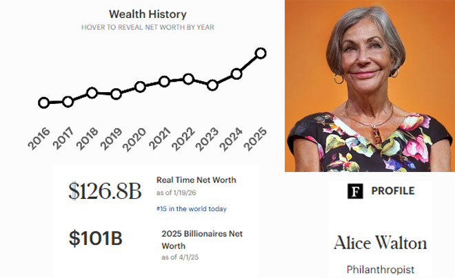 Người phụ nữ giàu nhất hành tinh là Alice Walton, con gái của người sáng lập Walmart, Sam Walton. Tính đến tháng 1 năm 2026, bà sở hữu khối tài sản ước tính 12638 tỷ đô la và là người giàu thứ 15 thế giới. Tài sản của bà đến từ cổ phần sở hữu trong chuỗi bán lẻ Walmart, được thừa kế từ người cha quá cố. Các anh trai của bà là Rob, Jim và John (mất năm 2005) cũng được thừa kế cổ phần trong Walmart từ cha mình. Vợ của John, Christy Walton và con trai của họ, Lukas Walton, được thừa kế cổ phần của John và cả hai đều nằm trong danh sách tỷ phú của Forbes .