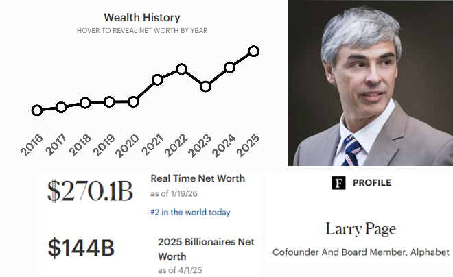 Larry Page đã thực hiện một cuộc "lội ngược dòng" ngoạn mục để trở thành người giàu thứ hai thế giới. Chỉ trong vòng chưa đầy hai năm, tài sản của ông đã tăng gấp đôi, từ mức 114 tỷ USD (2024) lên con số kỷ lục 270.1 tỷ USD vào đầu năm 2026.