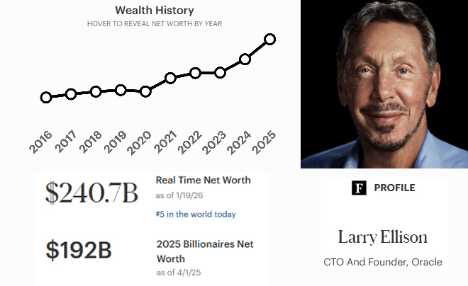 Ở tuổi 80, Larry Ellison vẫn chứng tỏ mình là một "mãnh hổ" trong giới tài chính. Với việc sở hữu gần 42% cổ phần Oracle, tài sản của ông đã có lúc chạm ngưỡng 400 tỷ USD vào tháng 9/2025 trước khi ổn định ở mức 240.7 tỷ USD vào đầu năm 2026 do sự điều chỉnh của thị trường công nghệ.
