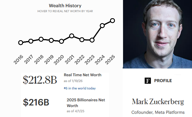Ở tuổi 40, nhà sáng lập Meta đang ở giai đoạn hoàng kim nhất của sự nghiệp. Với khối tài sản 212.8 tỷ USD, Zuckerberg đã ghi nhận mức tăng trưởng kỷ lục 112.6 tỷ USD chỉ trong một năm – con số lớn nhất trong số tất cả các tỷ phú toàn cầu.