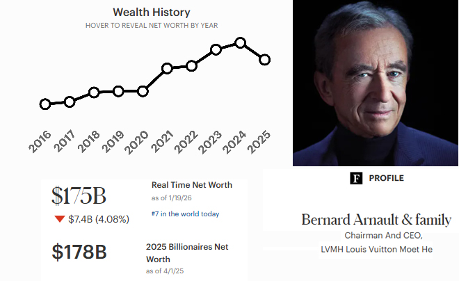 Dù nhường lại các vị trí đầu bảng cho các đại gia công nghệ Mỹ, Bernard Arnault vẫn duy trì vị thế vững chắc với 175 tỷ USD. Ông là người đứng đầu LVMH – tập đoàn sở hữu hơn 70 thương hiệu danh giá nhất thế giới như Louis Vuitton, Christian Dior, Tiffany & Co. và Sephora.