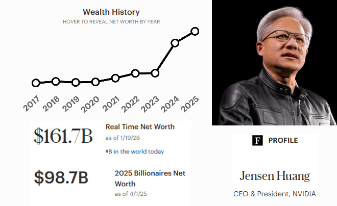 Dưới sự dẫn dắt của Huang, NVIDIA không còn chỉ là một công ty sản xuất chip đồ họa cho game thủ. Tháng 10 năm 2025, NVIDIA đã trở thành doanh nghiệp đầu tiên trong lịch sử đạt giá trị vốn hóa thị trường 5.000 tỷ USD. Với việc sở hữu khoảng 3% cổ phần công ty, tài sản của Jensen Huang đã tăng gấp đôi chỉ trong thời gian ngắn.