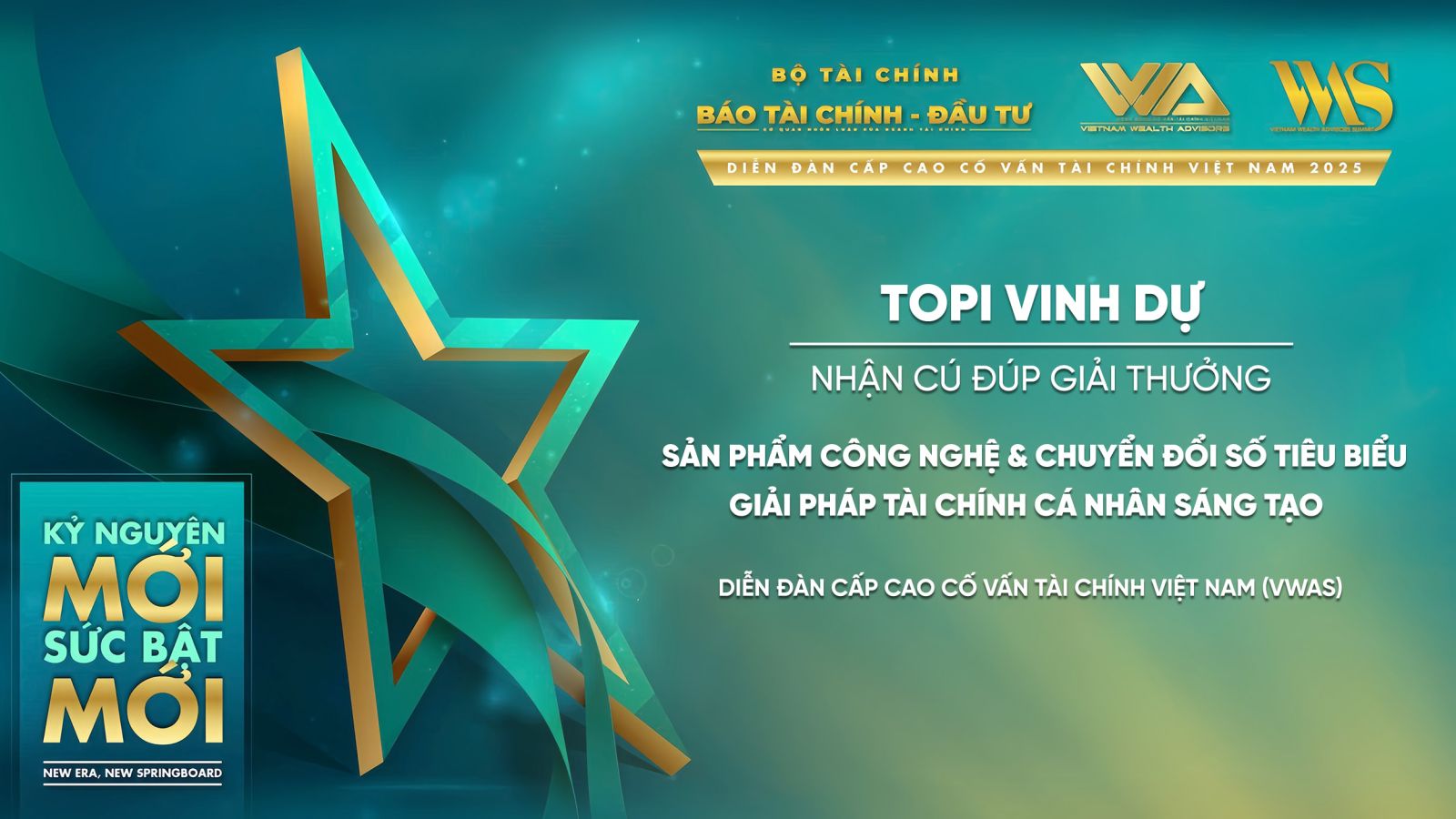Tại sự kiện Vietnam Wealth Advisors Summit (VWAS) diễn ra tại Khách sạn Pullman Hà Nội vào ngày 25/09/2025, TOPI đã được ghi nhận với 2 giải thưởng: “Giải pháp tài chính cá nhân sáng tạo” và “Sản phẩm công nghệ và chuyển đổi số tiêu biểu”.